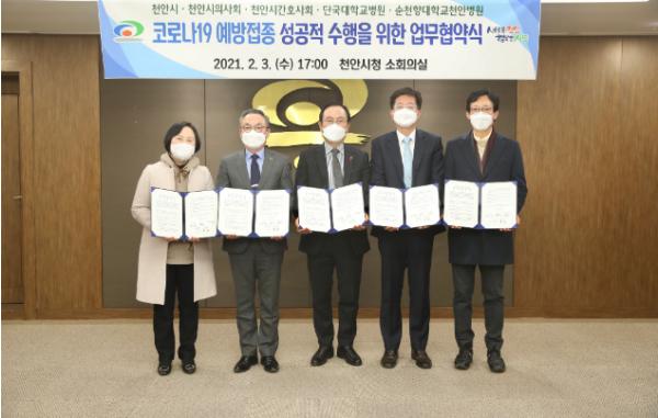 시는 3일 천안시청 소회의실에서 천안시의사회(회장 황동조), 천안시간호사회(회장 문명순), 단국대학교병원(병원장 김재일), 순천향대학교천안병원(병원장 이문수)과 코로나19 백신접종 상호 협력을 위한 업무협약을 체결했다.