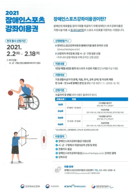 올해 장애인스포츠강좌 이용권 지원대상자는 만12~64세(1957. 1. 1. ~ 2009. 12. 31.) 등록장애인이다. 신청기간에 「국민기초생활보장법」에 따른 생계·의료·주거·교육급여 수급가구 및 차상위계층이 대상이며 장애인스포츠강좌이용권 홈페이지 및 동 행정복지센터를 통해 신청하면 된다.