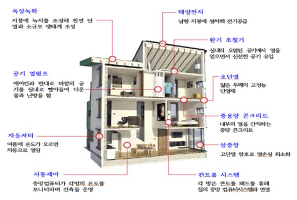 제로에너지 건축물이란 에너지 및 온실가스 감축을 위해 건축물의 에너지 사용량을 최소화하고 신재생 에너지를 자체 생산하여 건물의 총 에너지 소요량을 최소화하는 건축물을 말하며, 제로에너지 빌딩 실현을 위해 고단열재 사용, 고기밀 창호 및 외부 차양 설치, 고효율 설비 적용, LED 사용, 에너지관리시스템 설치, 태양광, 지열 등 신재생에너지를 건축물에 활용하는 기술을 건축물에 적용한다.