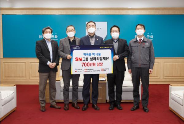 이날 기탁식은 SM그룹 삼라희망재단과 구미국가산업단지에 입주한 SM그룹 계열사인 티케이케미칼, 남선알미늄, 남선알미늄자동차사업부문, 벡셀과 함께 ‘Restart, 행복 구미운동’의 일환으로 진행됐으며, 구미시에서 추천하는 저소득 가정 및 사회복지시설 등에 떡국용 떡 3,500인분(700만원 상당)을 지원했다.