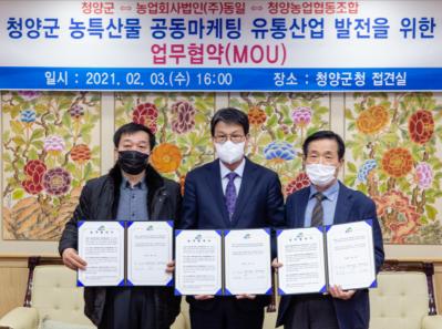 [한국연예축제일보, 안성경기자] 청양군과 ㈜동일, 청양농협이 지난 3일 지역농산물 이용확대와 공동마케팅을 위한 업무협약을 체결했다.