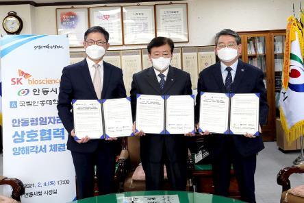 [한국연예축제일보, 안성경기자] 안동시는 2월 4일 오후 1시 시장실에서 지역소재 대기업인 SK바이오사이언스(대표 안재용), 국립안동대학교(총장 권순태)와 함께 투자양해각서(MOU)를 체결, 안동형 일자리사업을 본격 추진한다고 밝혔다.