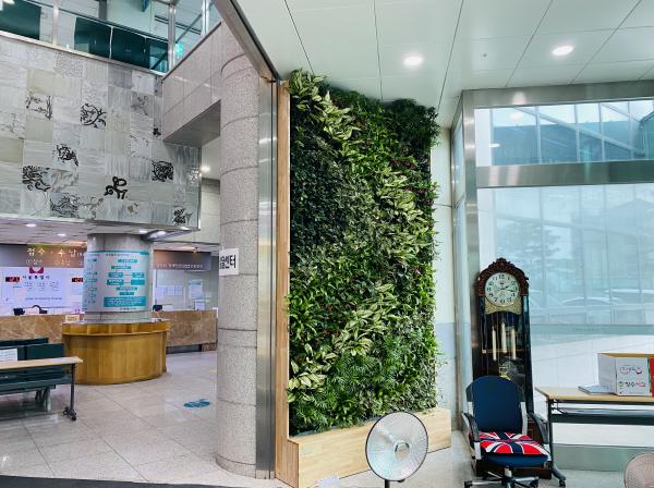 효율적인 공간 이용을 위해 본관 출입구 중심으로 산호수, 천양금, 파초일엽, 테이블야자 등 6종의 녹화식물을 도입하여 미세먼지 제거 및 공기정화 효과를 다양한 녹색 경관으로 조화롭게 연출하였다.
