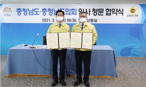김명선 의장과 양승조 지사는 4일 도청 상황실에서 이같은 내용을 담은 인사청문 협약을 체결했다.