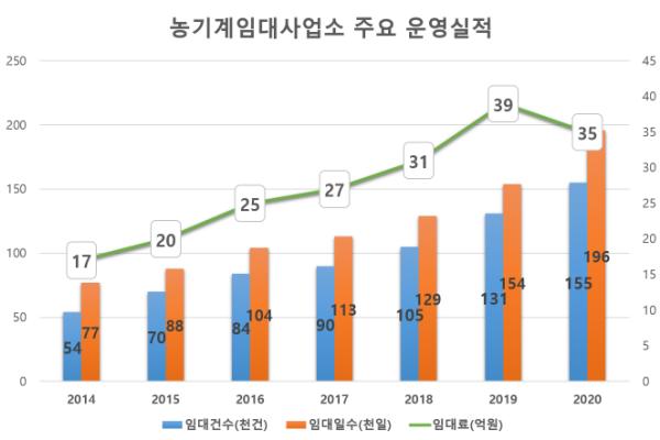도에 따르면 농기계임대사업소의 임대건수는 약 15만 5천여 건으로 ’19년 13만여 건과 비교하여 15% 증가하였고, 임대일수도 약 19만 5천여 일로 22% 증가한 것으로 집계되었다.
