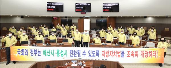 충남도의회(의장 김명선)는 4일 제326회 임시회 2차 본회의에서 ‘예산시·홍성시로 전환을 위한 지방자치법 개정 촉구 건의안’을 채택했다.