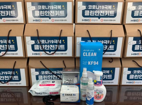 HSD엔진이 코로나19의 장기화로 보건위생용품 확보에 어려움을 겪고 있는 이웃을 위해 마련한 ‘코로나19 극복’ 클린안전키트는 비타민, KF-94 마스크, 손세정제, 손소독제, 항균물티슈 등 8종으로 구성됐다.