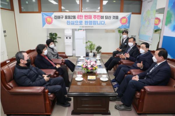 시는 이날 허성무 창원시장, 이치우 창원시의회 의장, 홍미옥 주민자치회장 등이 참석한 가운데 웅동2동 4만 번째 전입자에 대한 축하 이벤트를 마련했다.