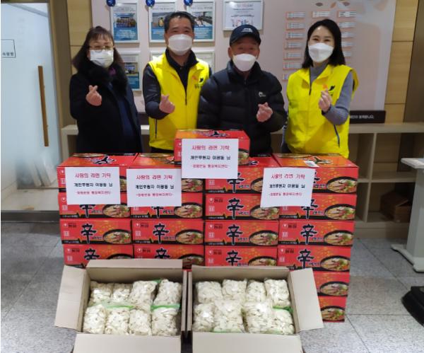 사)국제위러브유운동본부는 지난 설 명절을 맞아 관내 어려운 이웃을 위해 써 달라며 90만원 상당의 사랑의 생필품박스 20박스를, 관내 거주 중인 이광동 씨로부터는 라면 25박스 및 가래떡 25봉지를 기부 받았다.