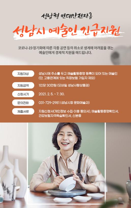 지급 대상은 2월 4일 기준 성남시에 주소를 둔 시민이면서 한국예술인복지재단의 예술활동 증명 등록이 완료된 예술인이다.