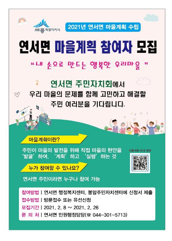 마을계획에는 참여를 희망하는 주민은 오는 26일까지 연서면 행정복지센터에 방문하거나 유선으로 신청할 수 있다.