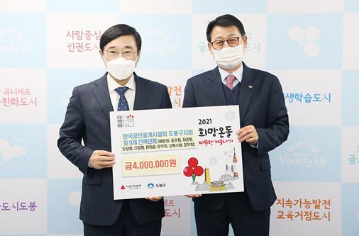 [한국연예축제일보, 유혜경기자] 도봉구는 2월 3일(수) 구청 소통협력실에서 한국공인중개사협회 도봉구지부 및 9개 지역단체로부터 ‘2021 희망온돌 따뜻한 겨울나기 사업 성금 전달식’을 가졌다.