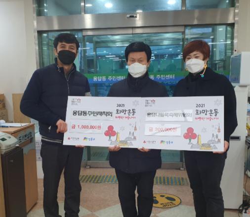 또한 코로나19로 각종 행사나 축제 개최에 어려움을 겪고 있는 상황 속에서 작년 11월 ‘제2회 용답나들목축제’를 언택트 방식으로 선도적으로 개최한 용답나들목축제위원회에서도 뜻을 함께해 목공 체험 행사 수익금 전액 20만 원을 기부하였다.