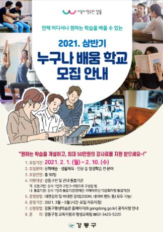 [한국연예축제일보, 유혜경기자] 강동구가 오는 2월 10일까지 주민이 원하는 학습을 언제, 어디서나 배울 수 있는 「누구나 배움 학교」 상반기 대상자를 모집한다.