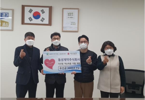 [한국연예축제일보, 유혜경기자] 지난 2일 ㈜동성제약이 남양주시 관내 취약계층을 지원하기 위해 1,100만원 상당의 유산균 300상자를 남양주시복지재단에 기부했다.