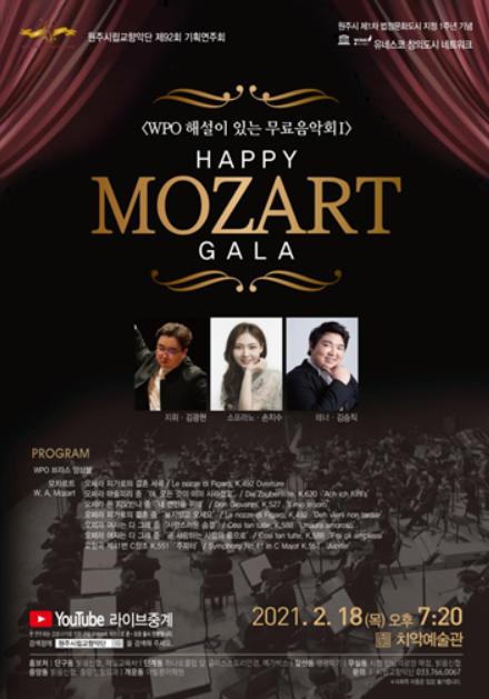 ‘Happy Mozart Gala’를 부제로 열리는 이번 연주회는 WPO 해설이 있는 무료음악회 첫 번째 시리즈로 ▲WPO 브라스 앙상블 오프닝 무대 ▲모차르트 피가로의 결혼 서곡 ▲모차르트 아리아 ▲모차르트 교향곡 제41번 ‘주피터’가 연주된다.