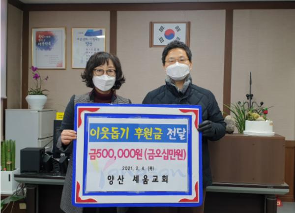 [한국연예축제일보, 유혜경기자] 양산시 신기동 소재 양산세움교회는 지난 4일 설명절을 맞이해 복지사각지대를 위해 써달라며 성금 50만원을 삼성동 행정복지센터에 기탁했다.