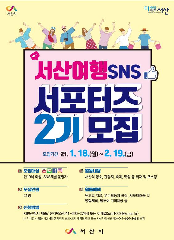 한편, 지난해 제1기 서산여행 SNS 서포터즈는 343건의 서산여행 홍보콘텐츠를 페이스북, 인스타그램 등 다양한 SNS채널에 홍보해 전국적으로 큰 호응을 얻었다.