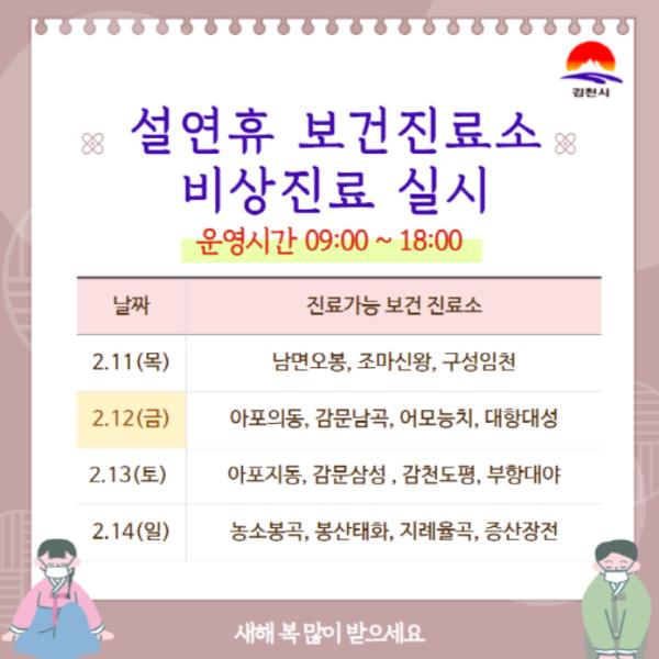 김충섭 김천시장은 “설 연휴기간 동안 시민 의료 불편을 최소화할 수 있도록 최선을 다하겠다.”며 “코로나19 확산 방지를 위해 이번 명절은 이동과 모임을 자제해 건강한 설을 보내시길 바란다.”고 전했다.