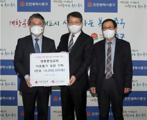 영종중앙교회(담임목사 황규진)는 지난 4일 인천 중구청을 방문하여 중구 관내 『먹거리 나눔 사업』을 위해 써달라며 ‘현금 10,000,000원’을 기탁했다.