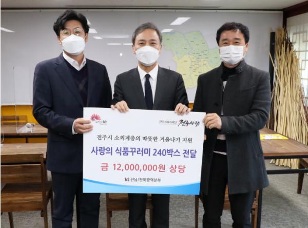 KT전남전북광역본부(본부장 서창석)는 5일 전주시장실을 찾아 코로나19 장기화로 생활에 어려움을 겪는 취약계층에 전달해달라며 1200만 원 상당의 식품꾸러미 240박스를 전주시복지재단 ‘전주사람’(이사장 유창희)에 기탁했다.