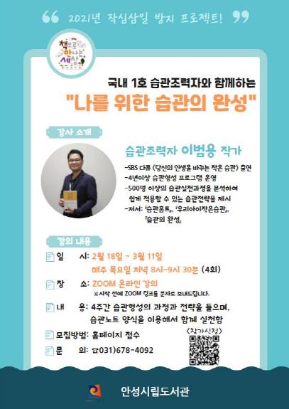 [한국연예축제일보, 유혜경기자] 안성시 진사도서관에서 오는 2월 18일부터 3월 11일까지 4주간, 매주 목요일 저녁 8시부터 ~ 9시 30분까지 변화를 꿈꾸는 사람들을 위한 『나를 위한 습관의 완성』을 운영한다.