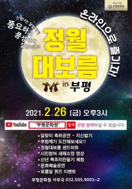 [한국연예축제일보, 유혜경기자] 인천광역시 부평구 부평문화원이 오는 26일 신축년 정월대보름을 맞아 ‘정월대보름 in 부평’ 비대면 온라인행사를 진행한다.