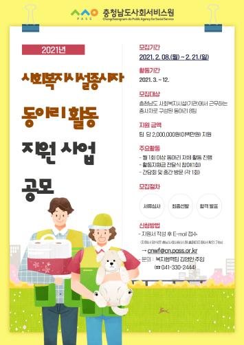 충청남도사회서비스원(원장 고일환)이 사회복지종사자 네트워크 구축 및 종사자 역량 강화를 위해 도내 사회복지시설 종사자 동아리 지원 사업을 공모한다.