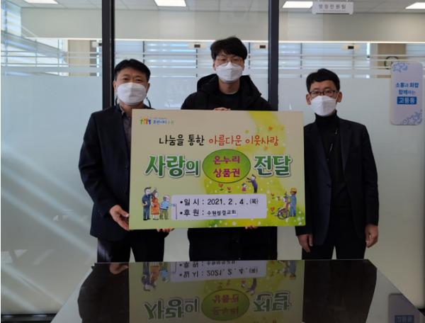이날 성결교회에서는 강준석 목사가 방문하여 신도들이 정성껏 마련한 온누리상품권 30매를 관내 어려운 이웃들을 위해 써 달라며 전달했다. 전달된 온누리상품권은 저소득 가구에 지원될 예정이다.