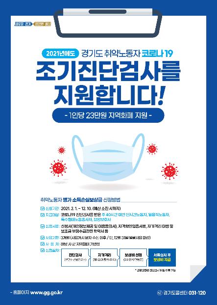 지난해 쿠팡물류센터에서 코로나 19로 지역 확산이 발생하던 시기부터 '병가 소득손실보상금'을 지급해왔으며, 올해는 지원대상을 더욱 확대해 취약노동자들이 안심하고 검사를 받을 수 있도록 지원한다.
