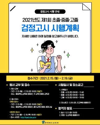 [한국연예축제일보, 서병진기자] 충청북도교육청은 2월 5일 오전 10시 도교육청 홈페이지에 ‘2021년도 제1회 초졸·중졸·고졸 검정고시 시행계획’을 공고했다고 밝혔다.