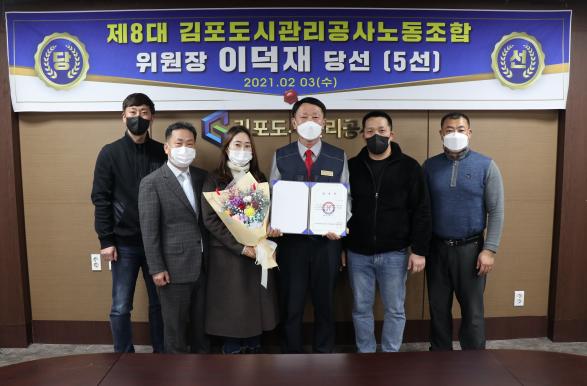 [한국연예축제일보, 유혜경기자] 지난 2월 3일 김포도시관리공사노동조합은 제8대 위원장으로 (現)이덕재 위원장이 당선되었으며, 2월14일부터 임기 3년의 위원장직을 수행한다고 밝혔다. 당선자는 2009년 제4대 위원장에 당선되어 5, 6, 7대 위원장을 연임하였을 뿐 아니라, 경인·강원본부장과 (現)전국지방공기업연맹 9대 위원장의 중책을 맡으며 전국지방공기업 노동현장의 수장으로서 임무를 수행해 왔다.