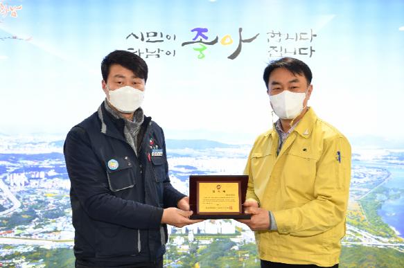 [한국연예축제일보, 유혜경기자] 김상호 하남시장이 5일 공무직 근로자 처우개선과 노동권익 향상에 노력한 공로로 시 공무직 노조로부터 감사패를 받았다.