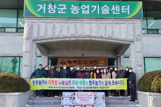 이번 나눔 행사는 한우자조금관리위원회에서 주최하고 거창축협의 후원을 받아 전국한우협회 거창군지부에서 주관하여 설 명절을 앞두고 우리 이웃과 정을 나누고 코로나19 장기화로 인한 어려운 상황에 조금이나마 보탬이 되기 위해 실시했다.
