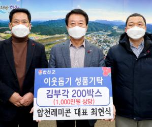 [한국연예축제일보, 유혜경기자] 합천레미콘은 지난 5일 합천군청을 방문하여 관내 사회복지시설에 전달해 달라며 1,000만원 상당의 김부각 200박스를 기탁했다.
