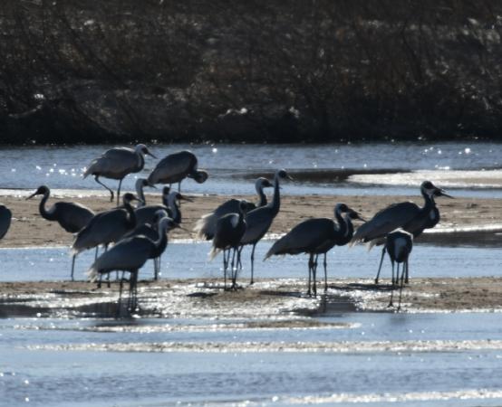 [한국연예축제일보, 유혜경기자] 구미시의 낙동강 해평·강정 습지에 2월 4일 오후 재두루미 55마리가 사뿐히 내려앉았다. 이날 관찰된 재두루미는 기존 해평·강정습지에서 월동하던 재두루미 가족 3마리(유조 1마리)와 함께 모래톱에 내려 앉아 먹이를 찾고 있는 모습이 포착되었으며, 충분한 휴식을 취한 후 이동 할 것으로 보인다.