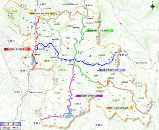 시는 평택호~한강 자전거길 외에도 한강, 팔당호 등으로 연결되는 총연장 120.3㎞의 6개 자전거 도로망을 조성한다. 올해 수지구 죽전동에서 처인구 모현읍을 잇는 경안천~탄천 구간을 시작으로 동남축 자전거도로를 순차적으로 조성한다는 계획이다