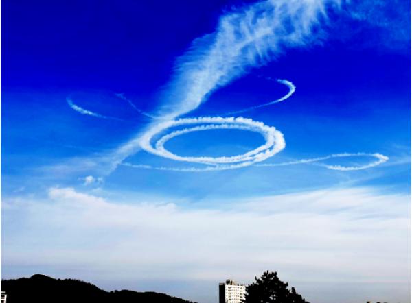 파란하늘에 흰 구름들이 너무 아름답고 특이한 모습이다. 흡사 비행기가 에어쇼를 하며 동그란 도넛을 만들고 날아 간 것처럼 아주 선명하고 아름답다.