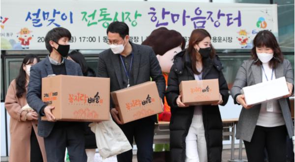 이번 한마음장터는 전통시장 상품 구매를 원하는 동구청 공무원들이 공동으로 주문해 직접 전통시장에 방문할 필요 없이 구청으로 일괄 배송하는 방식으로 이뤄졌다.