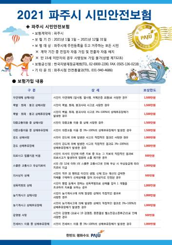 [한국연예축제일보, 유혜경기자] 파주시는 시민의 편익증진을 위해 기존 운영 중인 파주시 시민안전보험의 보장항목을 확대 운영한다고 8일 밝혔다.