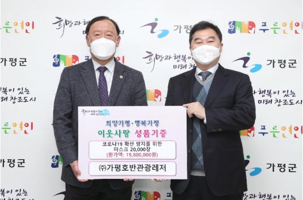 [한국연예축제일보, 유혜경기자] 지난 4일 ㈜가평호반관광레저에서 코로나19 확산 방지를 위해서 마스크를 기부하고 이에 대한 전달식을 군청 군수실에서 진행하였다.