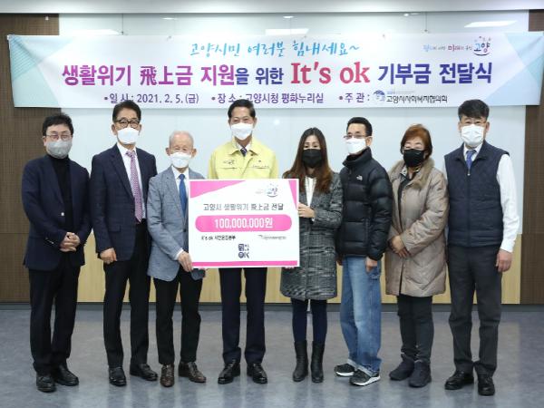 [한국연예축제일보, 유혜경기자] 고양시는 지난 5일, It’s ok 시민운동본부와 여러 단체·기관에서 기부캠페인으로 모금한 ‘고양시 생활위기 비상(飛上)금’ 1억 원의 전달식을 개최했다고 밝혔다.
