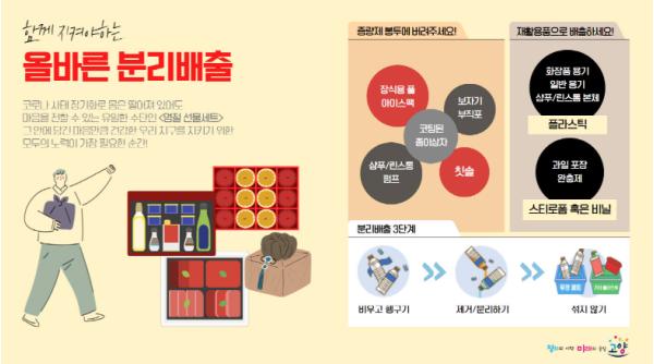 고양시 자원순환과 관계자는 “설 연휴기간 각 가정에서도 낭비되는 음식이 없도록 준비하고 재활용품 분리 배출 등 쓰레기 감량 및 분리배출에 협조하여 줄 것을 부탁드린다.”고 강조하며, “특히 올해는 ‘내 손안의 분리배출 앱’을 활용해 올바른 분리배출 실천방법을 확인하면 편리하다. 명절 선물세트의 부직포, 코팅종이, 혼합물질 등은 재활용이 불가하므로 종량제 봉투에 버리고, 과일포장 완충제는 스티로폼 혹은 비닐로 분리해 배출하는 등 각 사례별 올바른 방법을 ‘내 손안의 분리배출 앱’을 통해 바로 확인, 실천할 수 있으니 많은 이용 바란다.”고 당부했다.