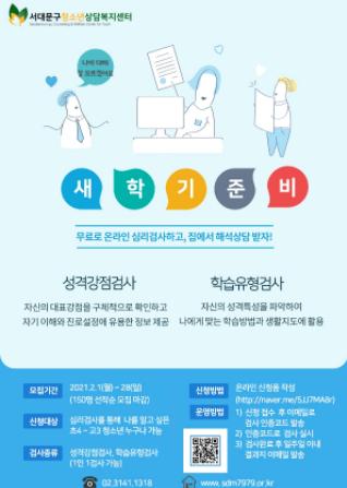 [한국연예축제일보, 유혜경기자] 서대문구는 서대문구청소년상담복지센터가 이달 말일까지 2021년 새 학기 준비를 위한 온라인 무료 심리검사를 진행한다고 8일 밝혔다.