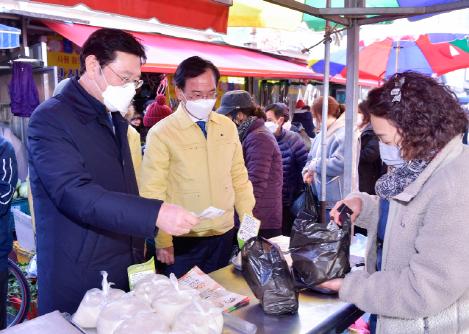 이용섭 시장은 첫 행선지로 코로나19로 이용객 감소 등 피해를 겪고 있는 광산구 송정매일시장과 송정5일시장을 찾아 설맞이 전통시장 장보기를 전개하고 상인들의 애로사항을 청취했다.