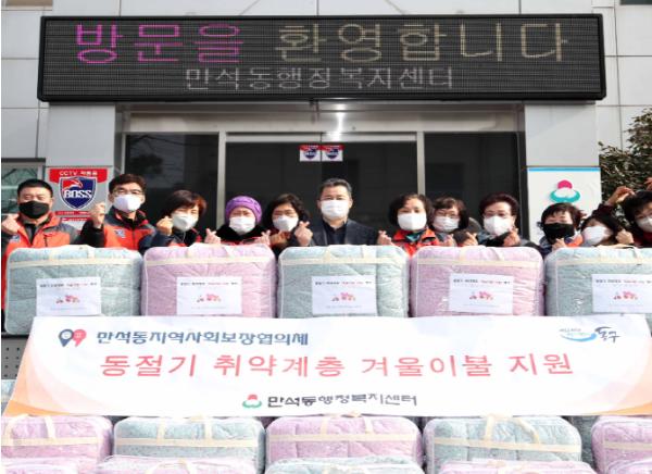 김한필 만석동장은 “이번 겨울은 코로나19로 취약계층에 대한 보다 많은 관심과 지원이 필요해 겨울이불을 제공하게 됐다”면서 “앞으로도 관내 어려운 이웃의 건강과 안전을 지키기 위해 최선을 다할 것”이라고 말했다.