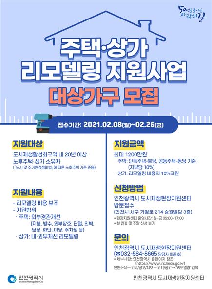 [한국연예축제일보, 유혜경기자] 인천광역시가 서구 "50년을 돌아온, 사람의 길”도시재생 뉴딜사업구역 內 20년 이상 노후 주택 및 상가에 대해 ‘리모델링 지원사업’참여자를 모집한다고 밝혔다.