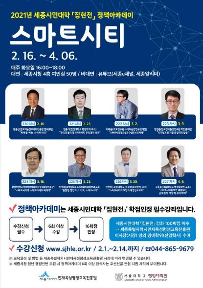 마지막으로 4월 6일에는 김동욱 서울대학교 행정대학원 교수가 ‘스마트시티를 위한 세종시민, 공무원의 역할과 우선과제’를 주제로 강연을 마무리한다.