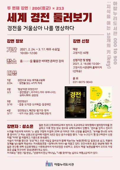 ‘세계 경전 둘러보기-경전을 거울삼아 나를 명상하다’강연에 대한 자세한 내용은 고양시 아람누리도서관로 문의하면 된다.