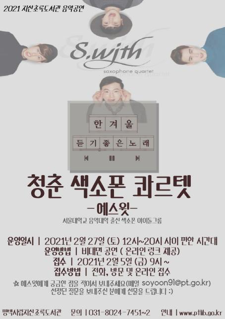 공연팀인 색소폰 콰르텟 ‘에스윗(S.WITH)’은 서울대학교 음악대학 출신으로 구성된 국내 유일의 젊은 색소폰 연주 4인조 그룹이다. 예술의 전당, 경기문화의 전당, 스타벅스 코리아 등 다수의 초청 연주 이력을 가지고 있으며, 클래식을 기반으로 하여 팝, 가요 등 다양한 장르의 음악을 ‘에스윗(S.WITH)’만의 멋진 하모니로 선사할 예정이다.